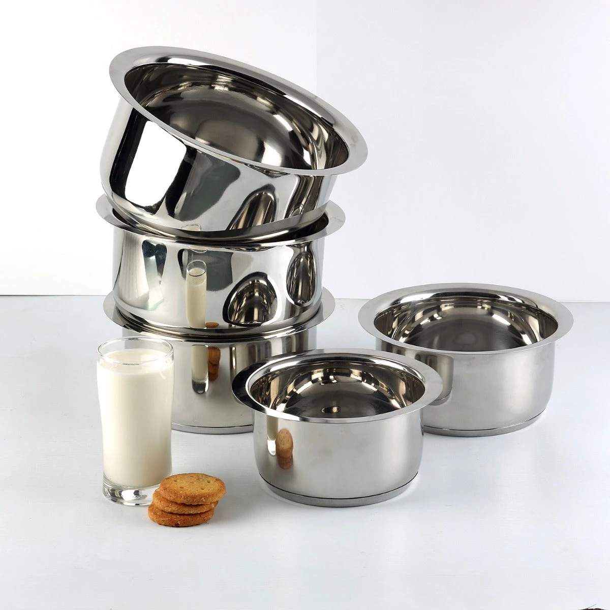 Made in India and crafted from the finest quality stainless steel this 5 piece set consist of a 0.8 litre, 1 litre & 1.4 litre, 1.8 litre and 2.2 litre tope without lids. Thick encapsulated sandwich (SAS) bottom, with an aluminum core ensures even heat distribution.