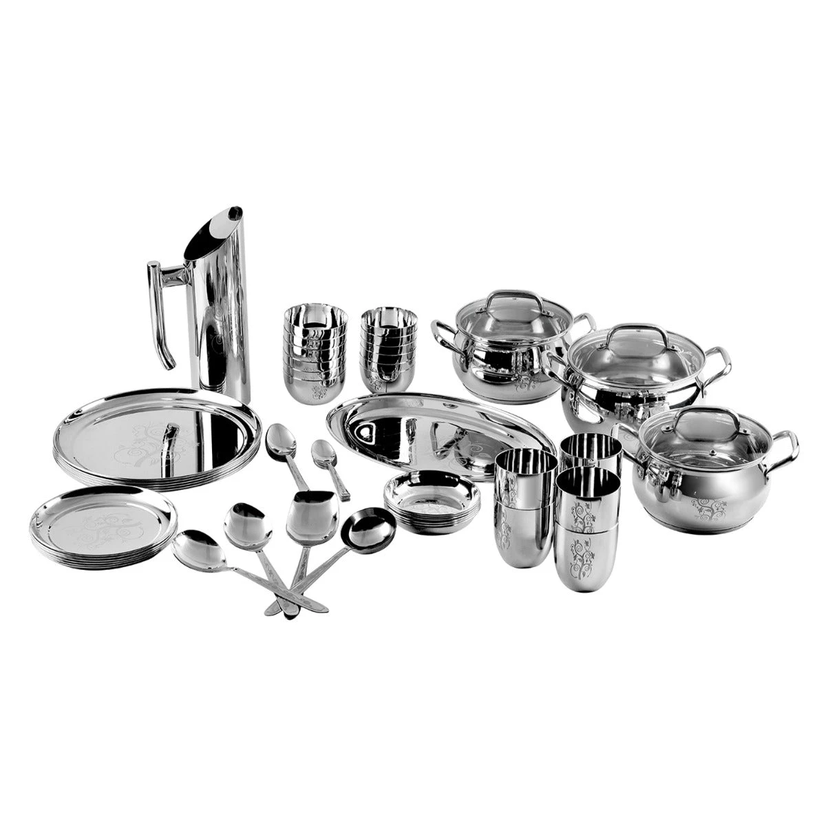 | Package Content | Rajbhog plate 28cm – 6 piece, Rajbhog Side plate 18.5 cm – 6 piece, Vati 8.5 cm – 6 piece Premium Glass – 6 piece, Halwa Plate – 6 piece, Dessert Spoon – 6 piece, Serving Spoon – 4 piece, Tea Spoon – 6 piece, Oval Serving Tray 30 cm – 1 piece, Glory Jug 1.6 Litre, Sicily 16 cm casserole – 2 piece, Sicily 18 cm casserole – 1 piece |