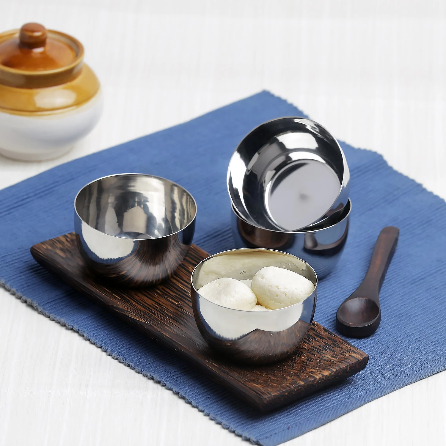Its unique mirror finish shine makes it ideal for your dinning table. As stylish as our products look, we never compromise on the material they are made of. This vati set is made of 100% food garde BPA free stainless steel with zero toxins. For the quality that they serve you, this vati set demands minimal maintenance. The stainless steel surface can be wiped squeaky clean with a wet sponge or a cloth. It can even be used in a dishwasher.