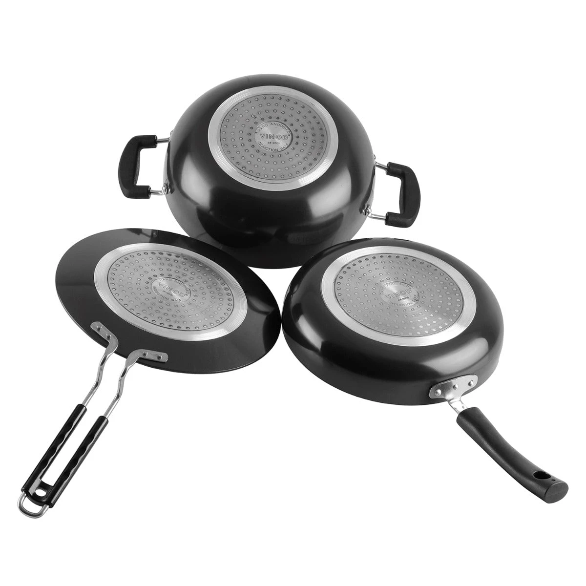 This cookware set has a kadai which ideal for sauteing, deep frying, and for preparing curries and gravies.The frypan can be used for making stir fried vegetables, aloo tikkis, cutlets and much more. The tawa is ideal for making roti/ chapati/parathas or phulkas. This cookware set is compatible with both induction and gas stove top.
