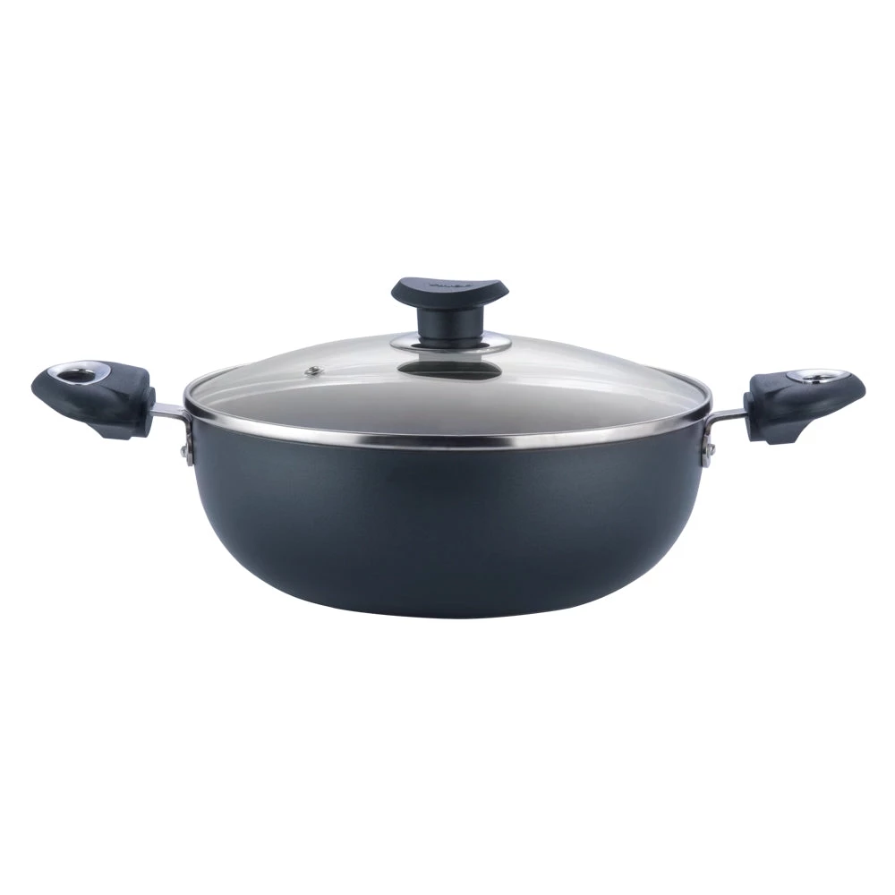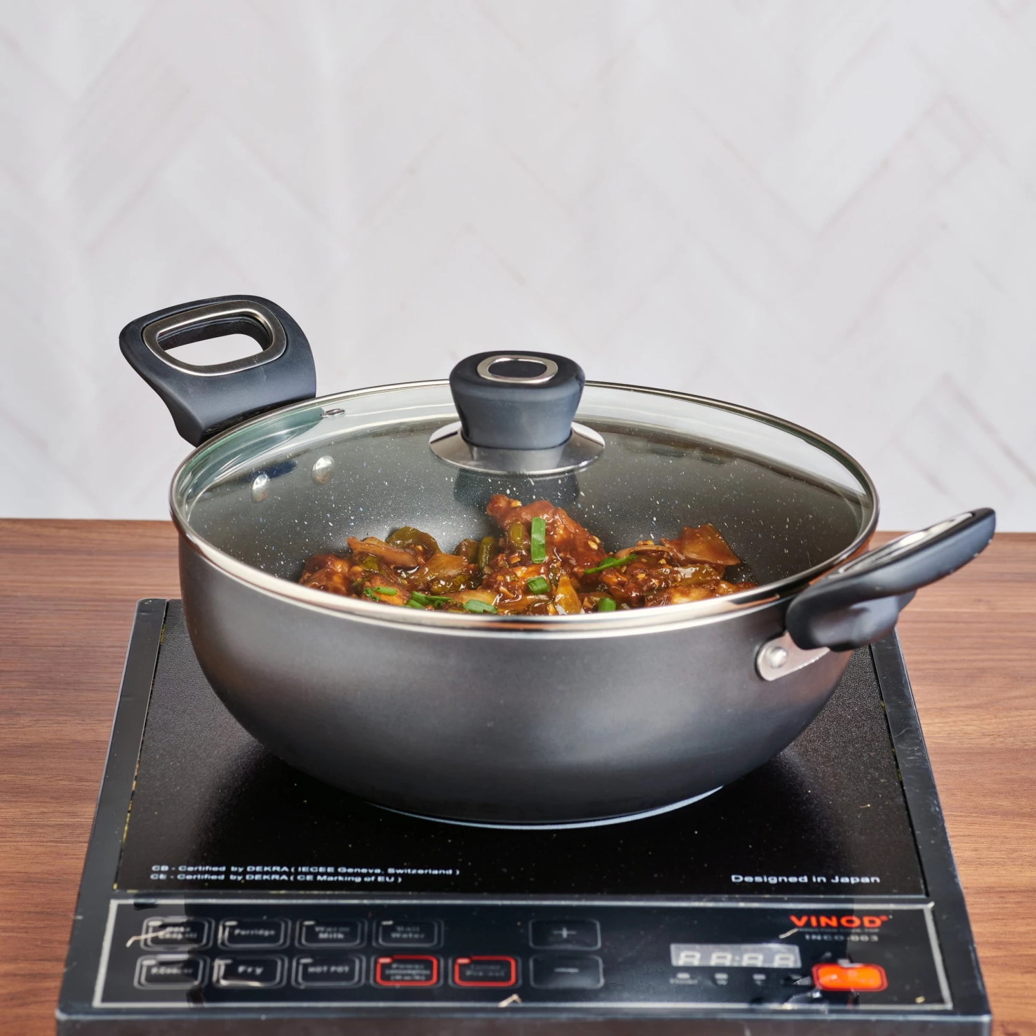 This non stick kadai is both gas stove and induction compatible and is dishwasher safe as well. It is ideal for sauteing, deep frying, and for preparing curries and gravies. It comes with tempered glass lid which allows you to see through the cooking process.