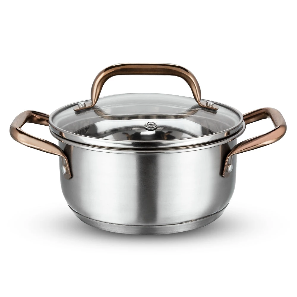 This Oxford set of two comes with exquisitely polished rose gold handles that are stylize your dining experience while providing maximum durability and comfort. The addional glass lids with steam vents facilitate faster cooking and easy monitoring during the cooking process. It is compatible across all heating platforms like gas, induction, ceramic, infrared and hotplate.
