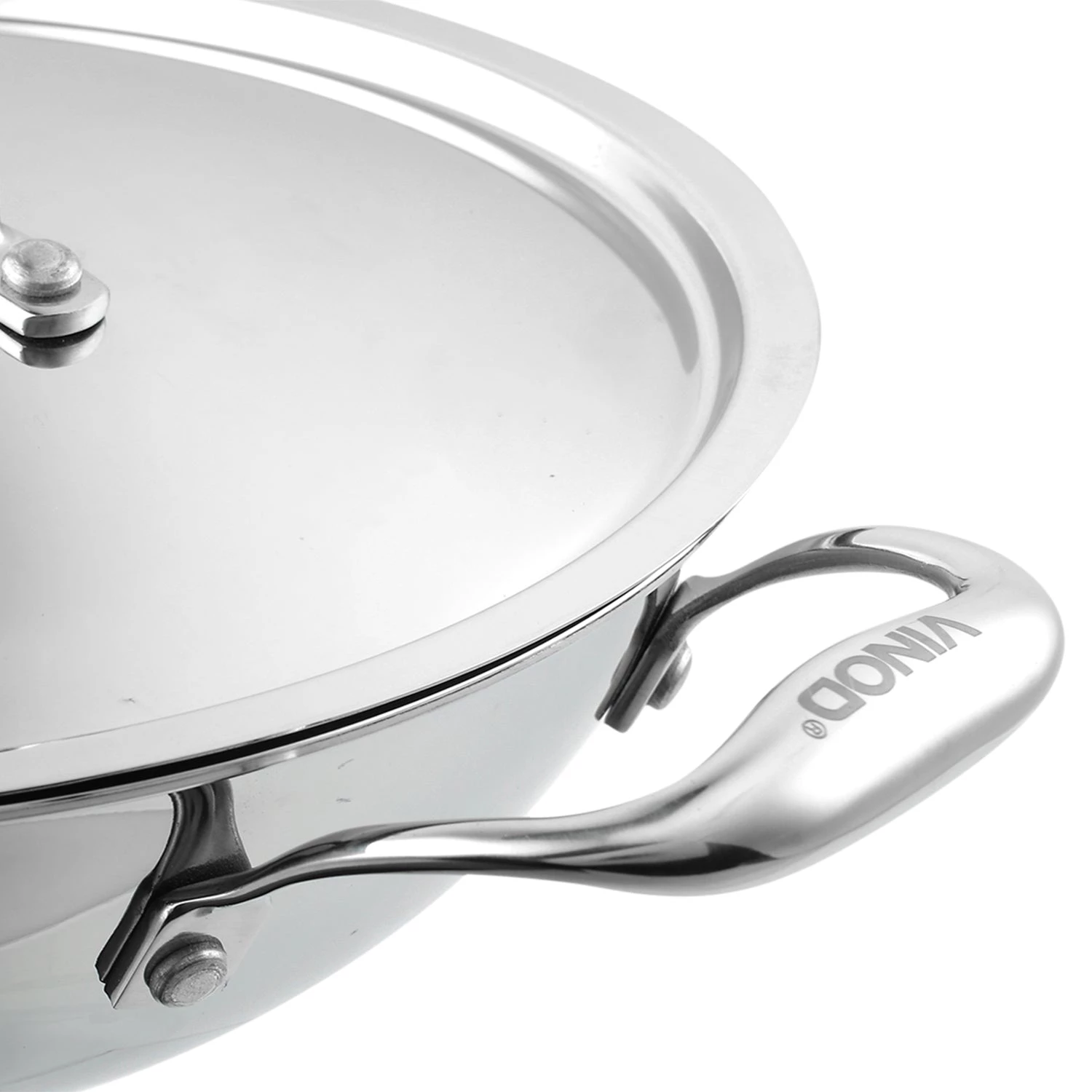 The third layer is made of AISI 430 grade magnetic stainless steel for induction compatibility. The kadai can be used for sauteing, deep frying, and for preparing curries and gravies.
