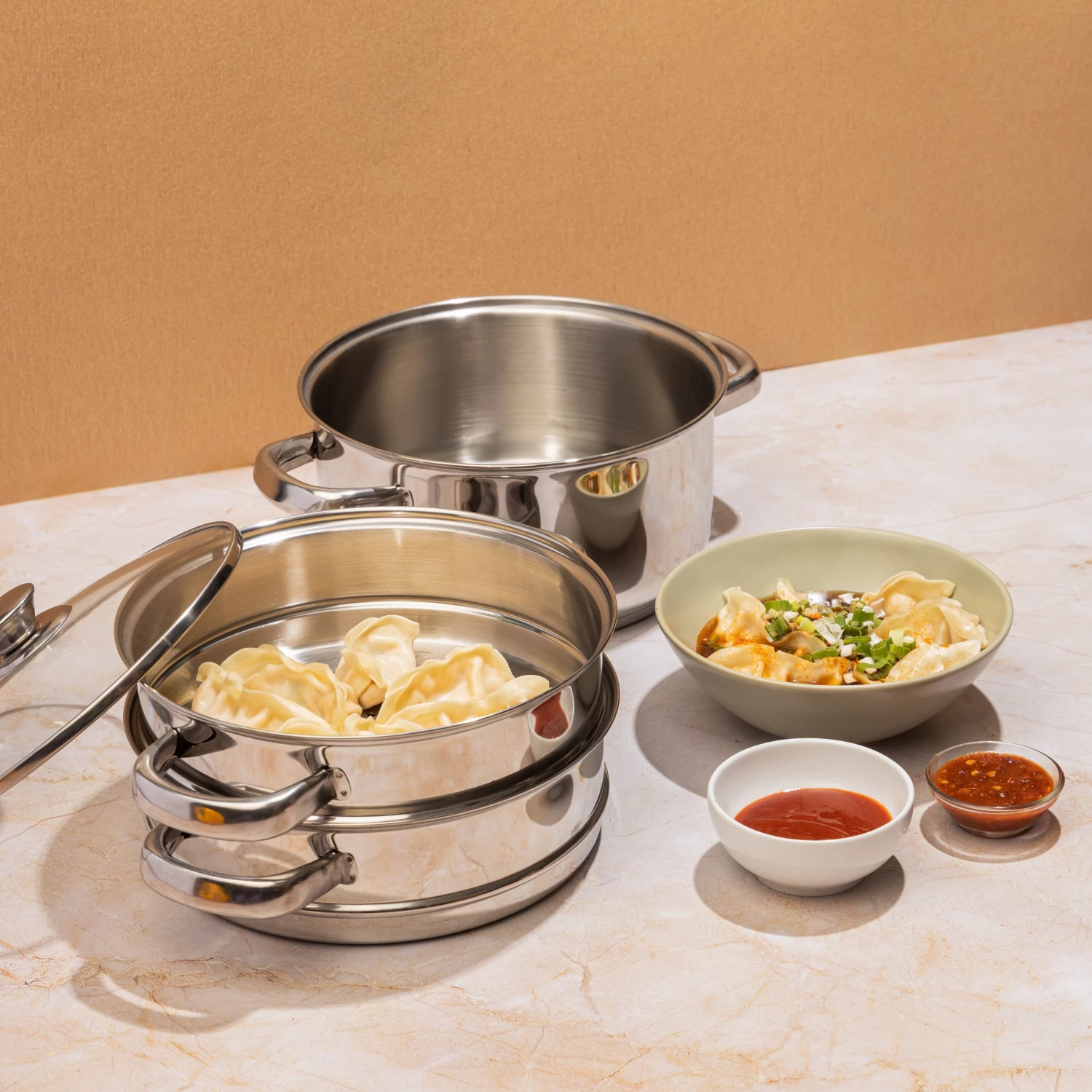 Steaming vegitables and meat are one of the best ways to enjoy a healthy meal. Steaming allows water vapor to heat food without loss of nutrition so a good quality steamer is must have kitchen essential. The Vinod three tier stainless steel steamer keeps the health factor in check.