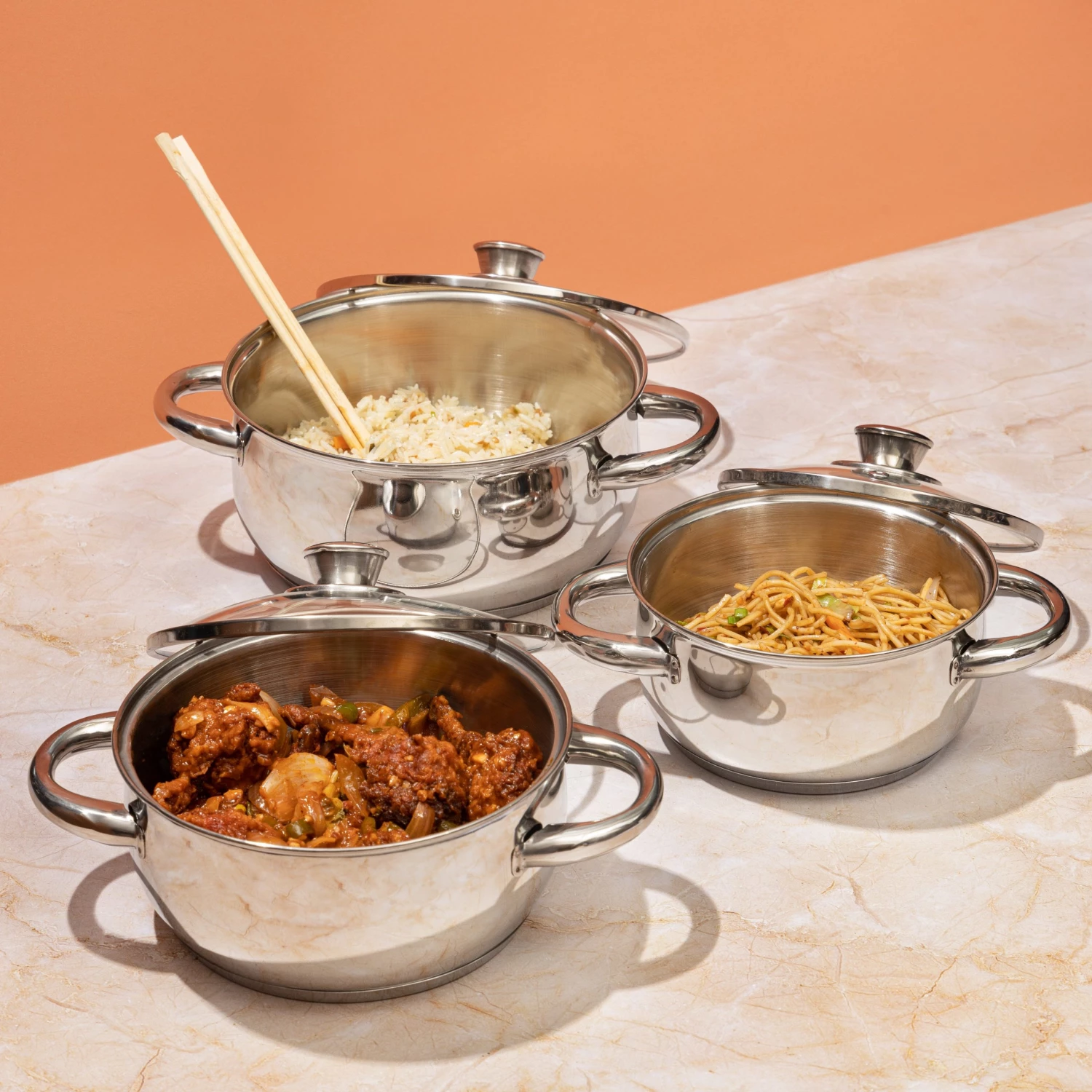 The Milano 3 piece casserole set boasts a robustly constructed wide body that facilitates easy stirring and vaporization. The components of this set make cooking a breeze. Its handles stay cool to the touch and ensure a firm grip when cooking or lifting. Made from food grade high quality, thick stainless steel for longer use.