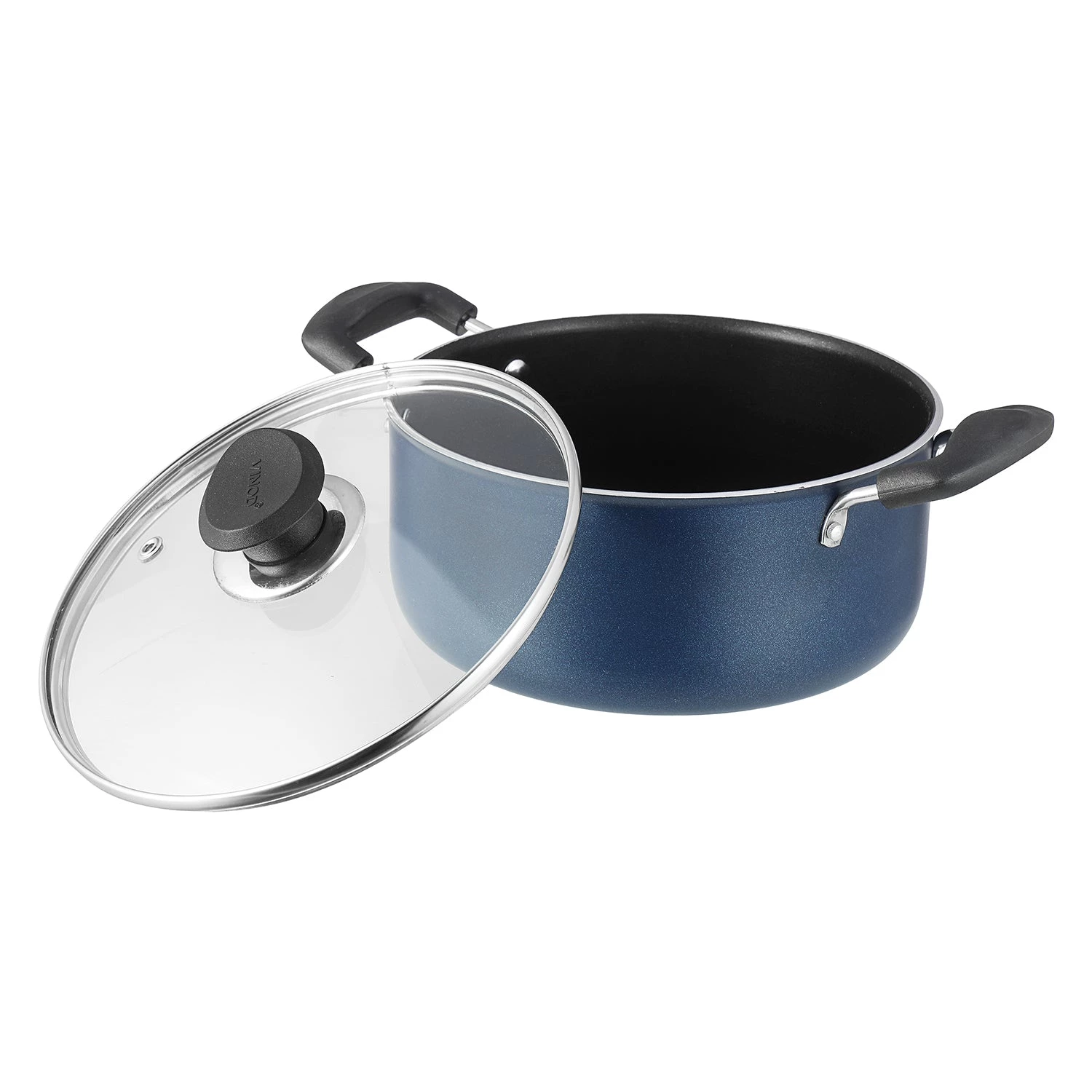 Vinod non-stick casserole is made up of thick aluminium. You can conveniently cook rice, dal, curries and many more delicacies in this cookware. This casserole has 2 sturdy riveted handles, for your convenience. This Vinod non-stick casserole comes with tempered glass lid which allows you to see through the cooking process. This casserole can be used for serving too. This casserole is only gas stove compatible.
