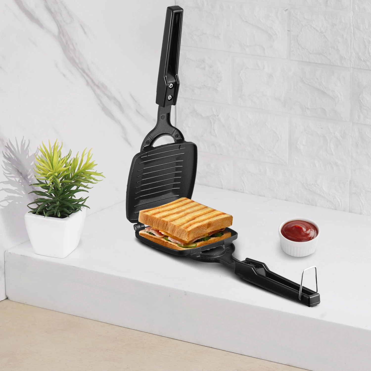 This non stick sandwich toaster is gas stove compatible. It is free from PFOA, heavy metals and harmful chemicals. So much better than cheap coatings that peel off and lose effectiveness within a few months of use. It is ideal for making sandwiches.